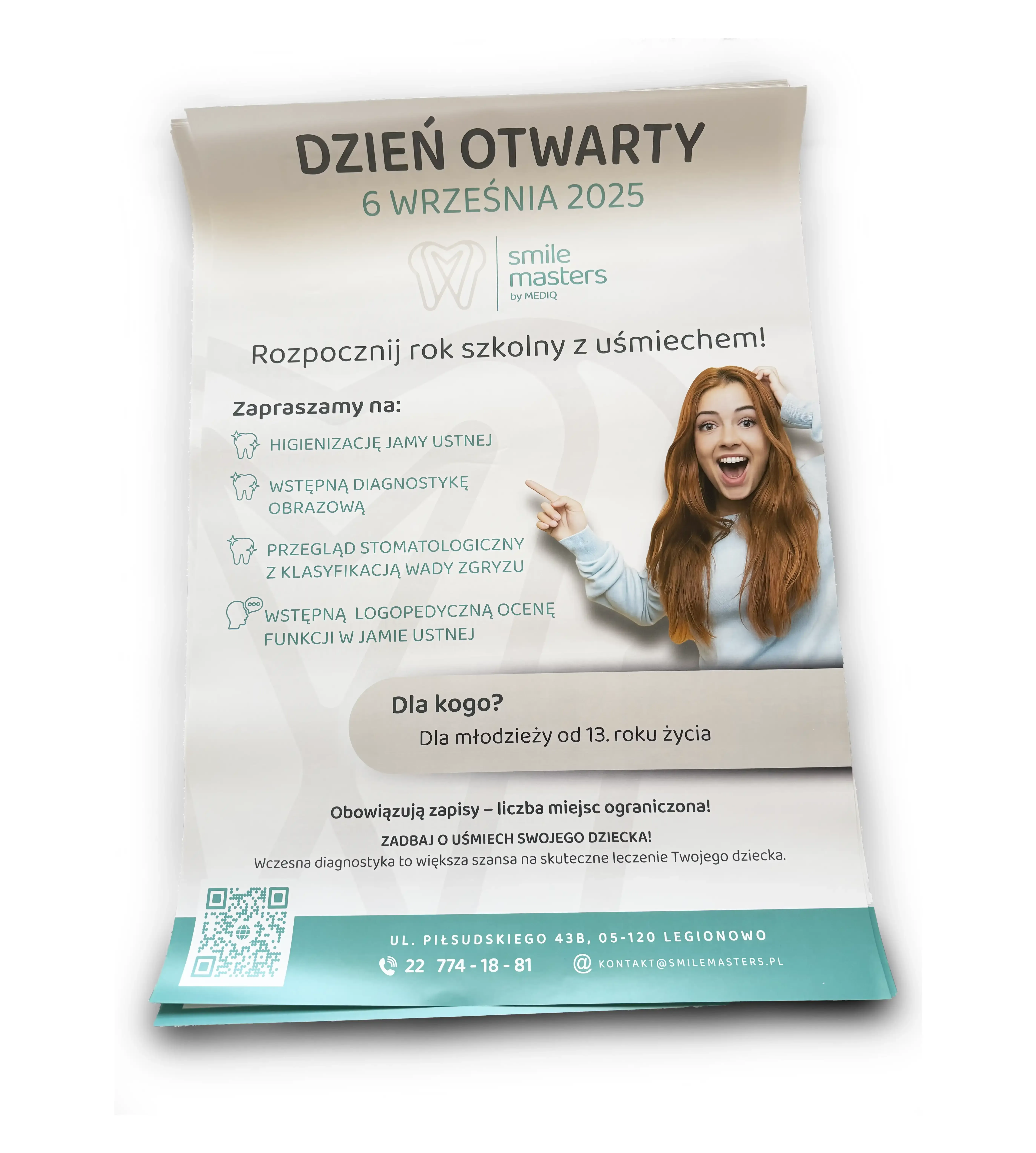 Plakat promujący Dzień Otwarty dla Smile Masters by MEDIQ